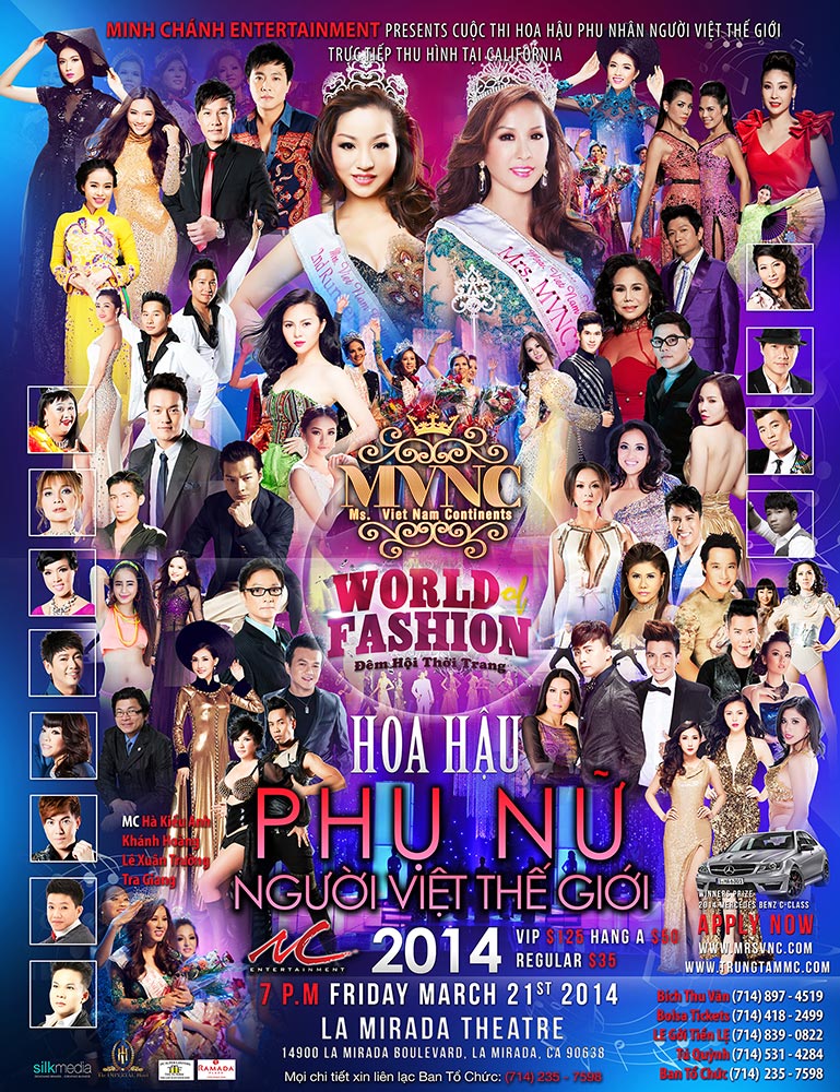 Hoa Hậu Phụ Nữ Người Việt Thế Giới (Ms Continents 2014) năm nay sẽ tổ chức tại La Mirada Theatre đáp lại sự chờ đợi của nhiều khán giả và khách mốn thưởng thức nghệ thuật & giải trí DVD ca vũ nhạc trình diễn thu hình live show, muốn thưởng thức một chương trình đa diện, trẻ trung không giống các DVD khác vẫn sản xuất đều đặn vài lần trong năm