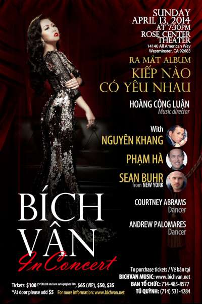 Ca Sĩ BV cho biết thêm về Chương trình “Bích Vân in Live Concert” ngày 13 tháng 4 sẽ được dàn dựng liền mạch với nhau từ đầu đến cuối để cảm xúc của người diễn và người nghe được chuyển tải cho nhau mà không bị gián đoạn. BV có mời 2 Ca Sĩ Nguyên Khang & Phạm Hà. Đặc biệt những tiết mục Nhạc Kịch BV dàn dựng với phần hát, múa và diễn xuất sẽ đem đến sự mới lạ cho khán giả. BV hy vọng sẽ đem đến những điều thú vị, hay và mới lạ đã học tập được ở New York. BV rất ao ước quý độc giả sẽ đến để cùng chia sẻ và thưởng thức những nét “ lãng mạn, sang cả và ngọt ngào” trong đêm nhạc BV, ủng hộ CD thính phòng đầu tay của BV vì qua CD nhạc VN này, BV mong muốn được “về nguồn” để tiếp tục giữ gìn ngôn ngữ và kho tàng âm nhạc thật giá trị của dân tộc Việt Nam. Quý vị ở xa cũng có thể ủng hộ CD này của BV qua chi tiết liên lạc: