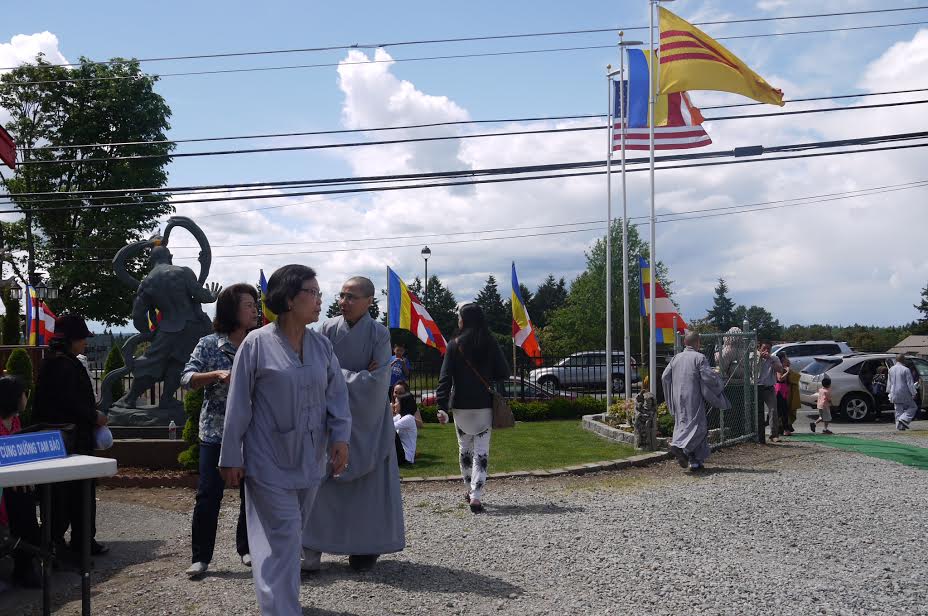 Hình ảnh trên là tại cổng chùa Vạn Hoa, trong chiều ngày 18-5, với lá Quốc Kỳ VNCH và Phật Kỳ và cờ Hoa Kỳ tung bay trước gió… như chung niềm vui của khắp các ngôi chùa tại hải ngoại hiện nay, điển hình như từ ngôi Chùa lớn lao bề thế như Chùa Cổ Lâm, Quan Âm Tịnh Xá, Chùa Vạn Hạnh đang xây cất và kể cả Đạo Tràng nhỏ nhắn- Phước An tại thành phố Newcastle, các nơi này vẫn luôn lôi cuốn mọi lứa tuổi, đặc biệt là thế hệ thanh thiếu niên, đến tụ tập học Đạo, học Việt ngữ học ca hát sinh hoạt tập thể thanh thiếu niên trong khung cảnh thanh bình lành mạnh.