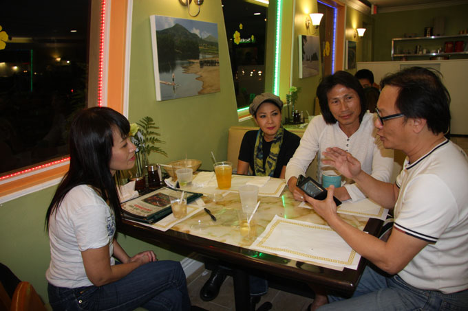 Ành 2: Ca sĩ kiêm ca sĩ Thúy Vi (trái) Ngọc Huệ (giữa) và Lê Xuân Trường (góc phải) bàn thảo những đóng góp chung nhau cho các chương trình văn nghệ ý nghĩa tại Nhà Hàng Quê Em Quê Anh – Quận Cam, nơi có đông người Việt sinh sống nhất tại Hoa Kỳ…
