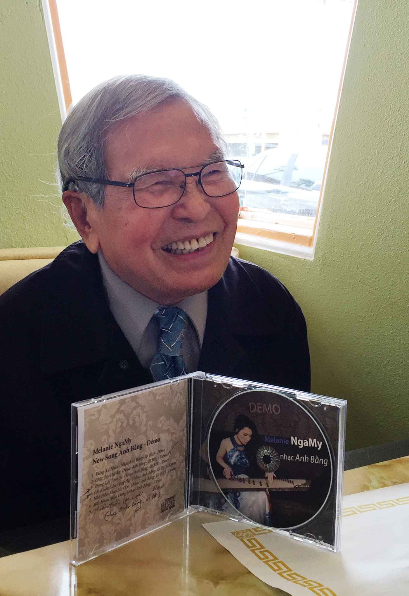 Ảnh 1: Nhạc sĩ Anh Bằng trong buổi phỏng vấn với nhà văn Phạm Quốc Bảo, trong ảnh do Melanie NgaMy hát tặng những ca khúc , mới nhạc sĩ Anh Bằng vừa sáng tác trong vòng vài năm gần đây. Nhạc sĩ Anh bằng cầm trong tay cuốn CD Démo của NgaMy: