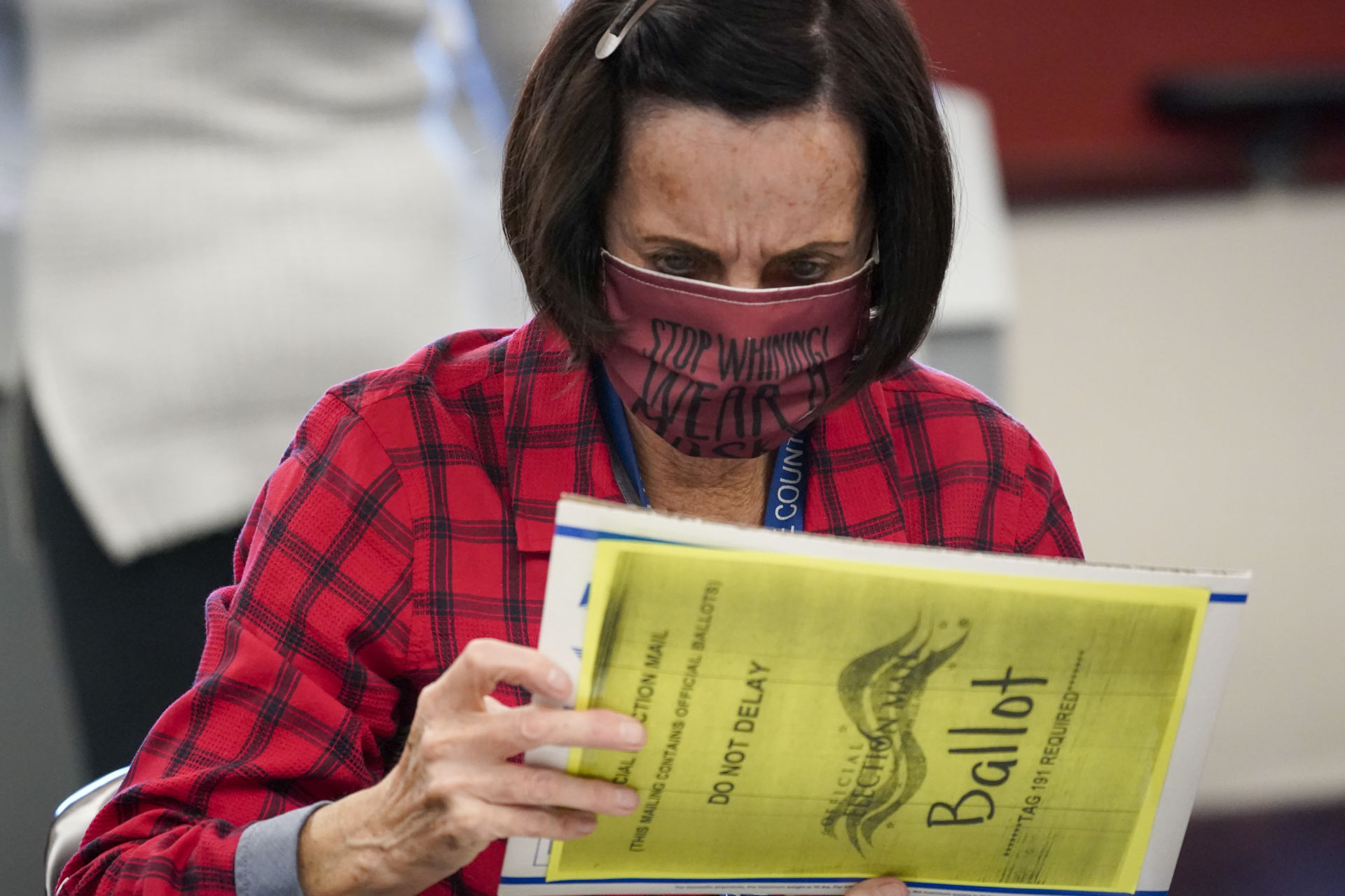 Nhân viên bầu cử ở Wilkes-Barre, Pennsylvania, hôm Thứ Sáu, 6 Tháng Mười Một, kiểm tra phiếu bầu nhận được sau ngày 3 Tháng Mười Một. (Hình minh họa: AP Photo/Mary Altaffer)